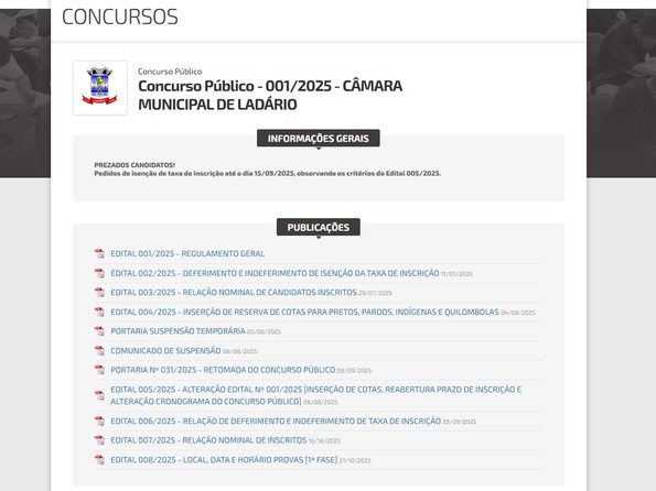 A Câmara Municipal de Ladário – Estado de Mato Grosso do Sul, por intermédio da Comissão de Concurso Público, constituída através da Portaria 27/2025 TORNA PÚBLICO para conhecimento dos interessados o Local, Data e Horário das provas escritas [1ª Fase] deste certame.