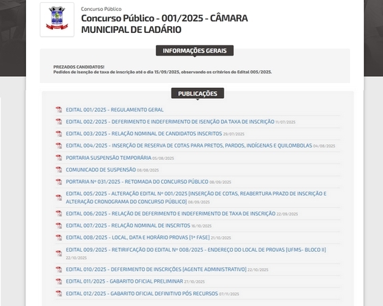 EDITAL DE CONCURSO PÚBLICO 012/2025 A Câmara Municipal de Ladário – Estado de Mato Grosso do Sul, por intermédio da Comissão de Concurso Público, constituída através da Portaria 27/2025 TORNA PÚBLICO para conhecimento dos interessados, em acolhimento ao pronunciamento da instituição responsável pela organização elaboração do processo concurso público, após análise dos recursos impetrados contra os gabaritos referentes às provas objetivas realizadas, apresenta a seguinte decisão.