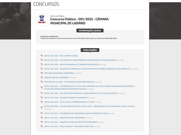 A Câmara Municipal de Ladário – Estado de Mato Grosso do Sul, por intermédio da Comissão de Concurso Público, constituída através da Portaria 27/2025 TORNA PÚBLICO para conhecimento dos interessados o Resultado da 1ª Fase [prova objetiva] do concurso público, conforme segue: